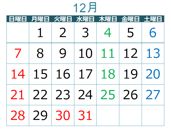 年末は12月29日(月)まで、年始は1月5日(月)から営業します。